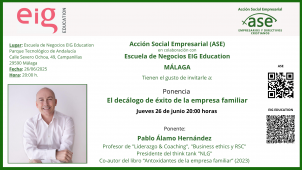ASE, en colaboración con la Escuela de Negocios EIG Education de Málaga, os invita a asistir a la ponencia "El decálogo de éxito de la empresa familiar" que impartirá Pablo Álamo Hernández, Profesor de "Liderazgo & Coaching", "Business ethics y RSC", Presidente del think tank "NLG" y Co-autor del libro “Antoxidantes de la empresa familiar” […]