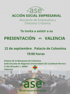 Queridos socios y simpatizantes de ASE-Acción Social Empresarial, nos complace convocaros al acto de referencia el próximo lunes 22 de septiembre a las 19:00 horas, donde llevaremos a cabo la presentación de Acción Social Empresarial-ASE en Valencia. El evento tendrá lugar en el palacio de la marquesa de Colomina, Sede de la Escuela de Negocios […]
